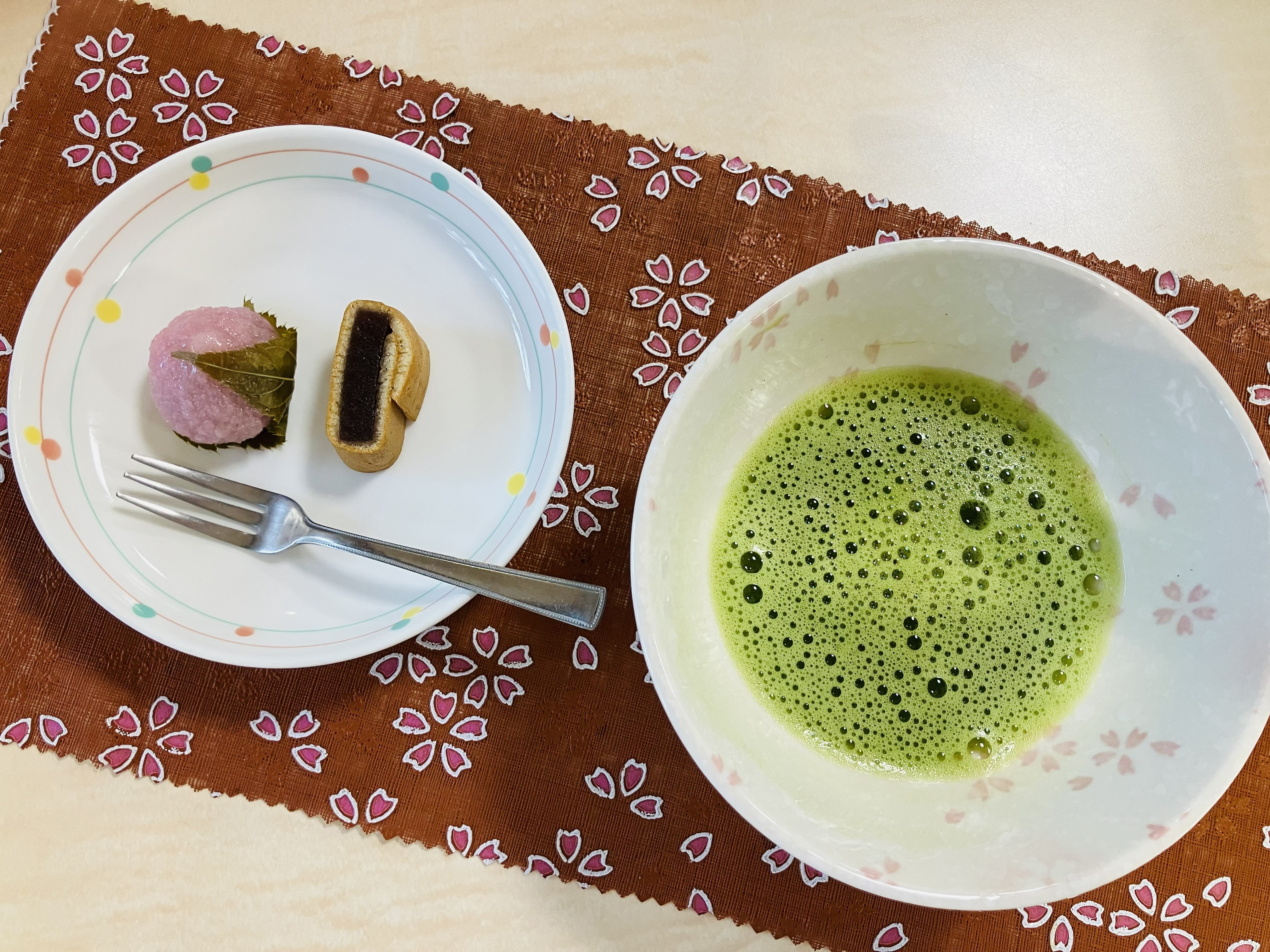 ゲームの後は職員が点てた抹茶と、春らしい和菓子を一緒に味わって頂きました。美味しいおやつを囲みながら、笑顔がたくさん見られた楽しい時間を過ごしました。