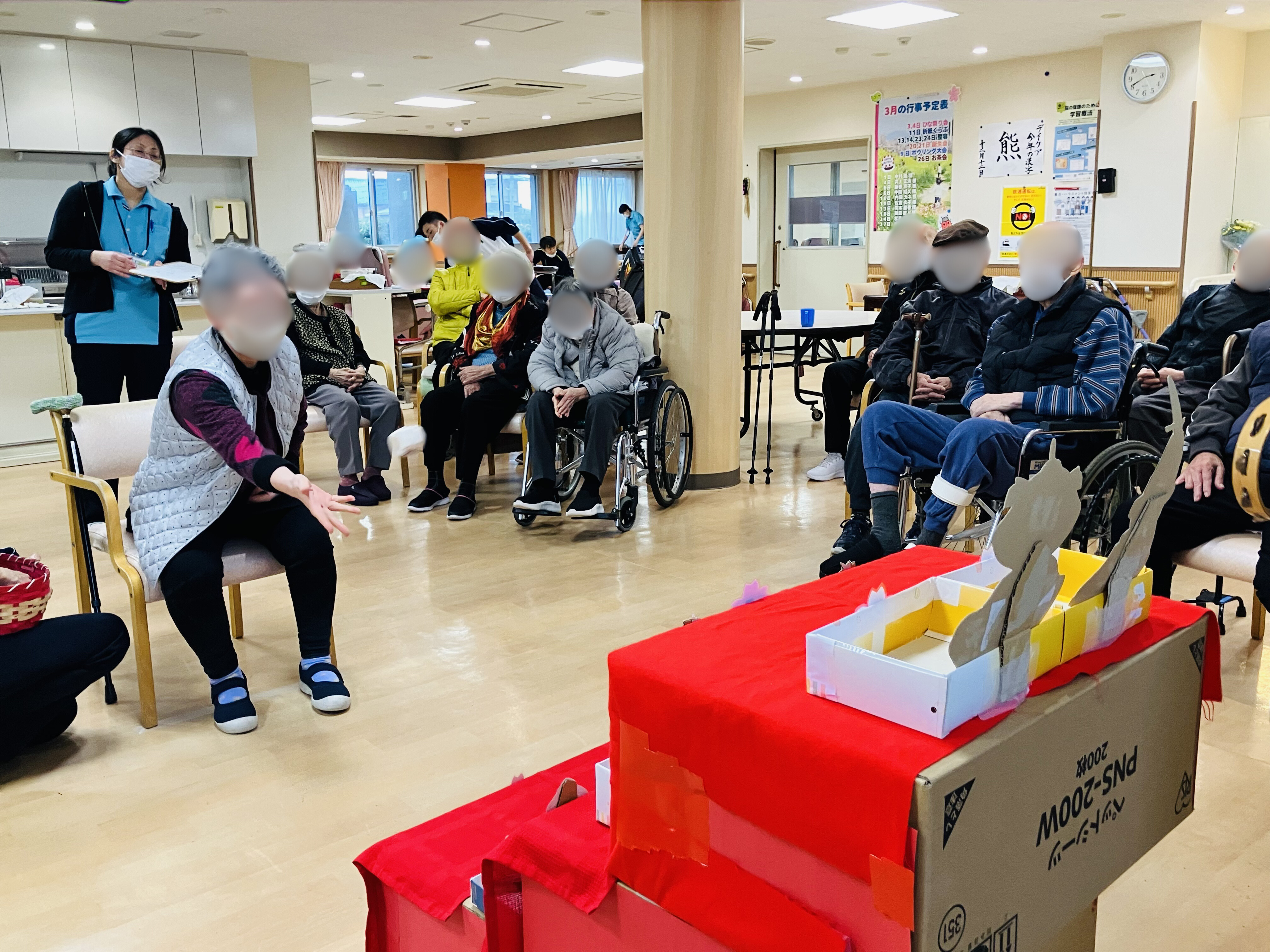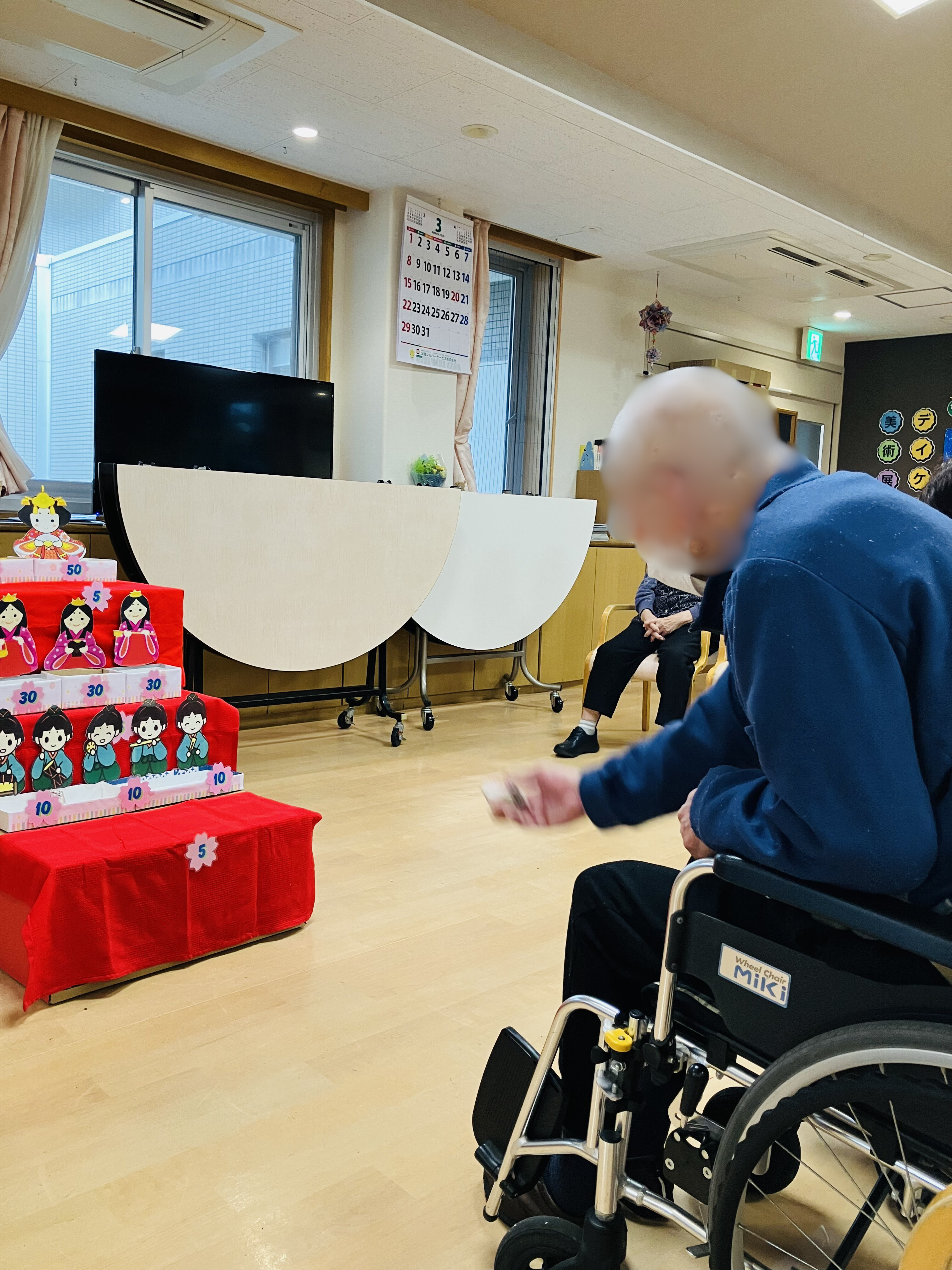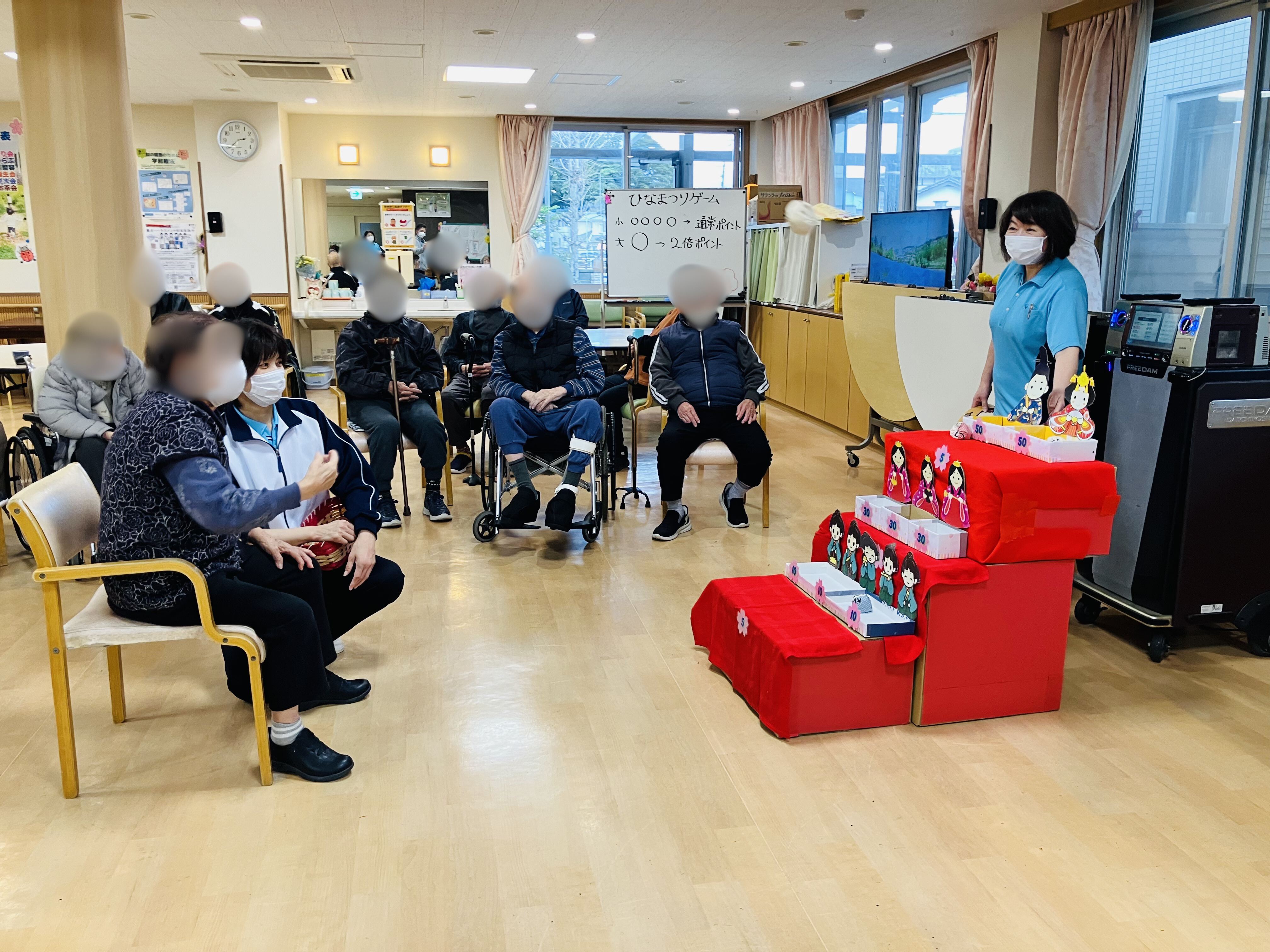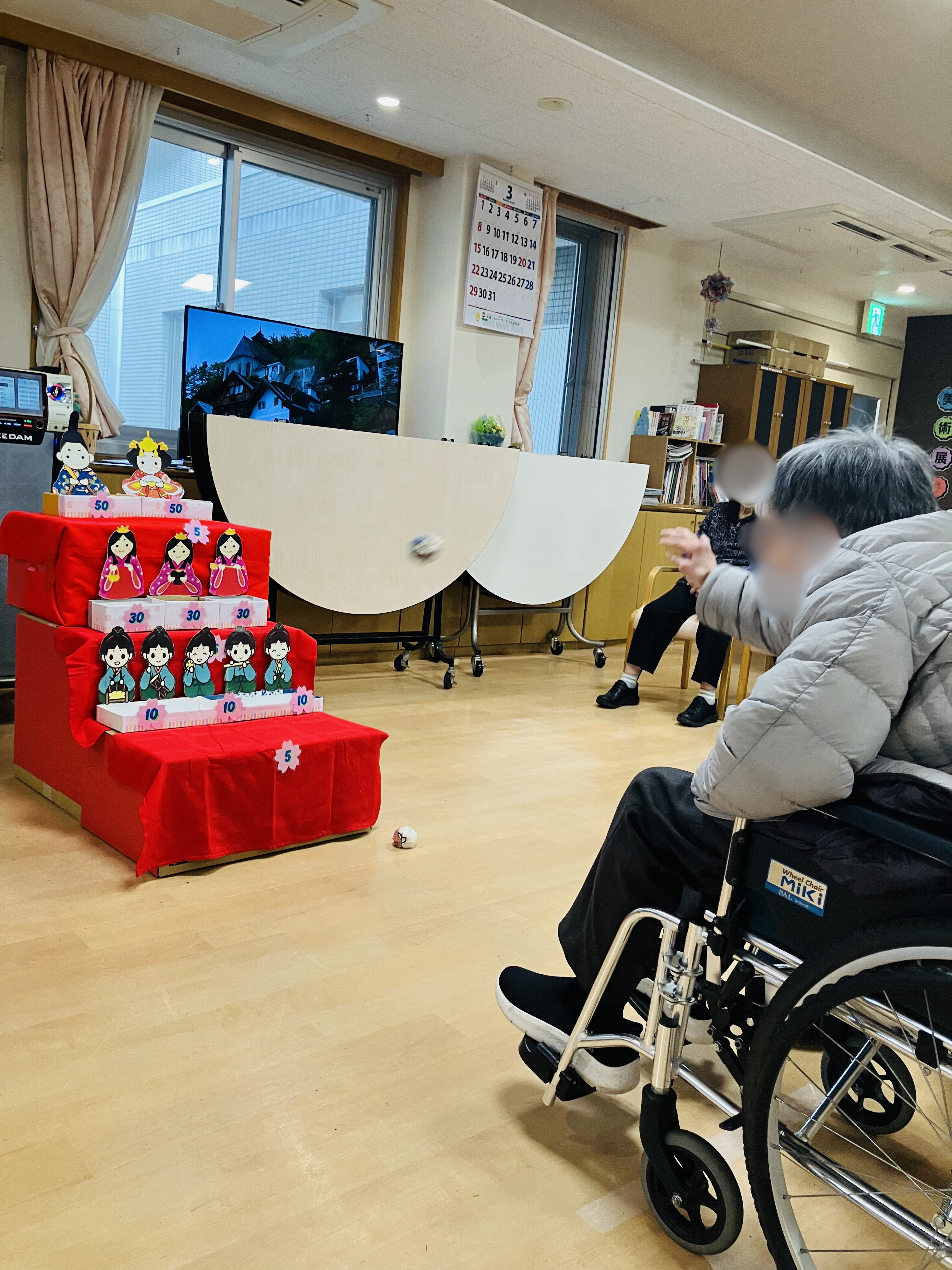 職員がこの日のために制作したひな壇を使用し、お手玉を投げて点数を競うゲームを行いました。上位1位から3位までのご利用者様には、なんとささやかですが景品もご用意しました。
